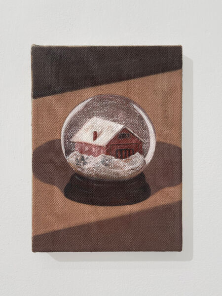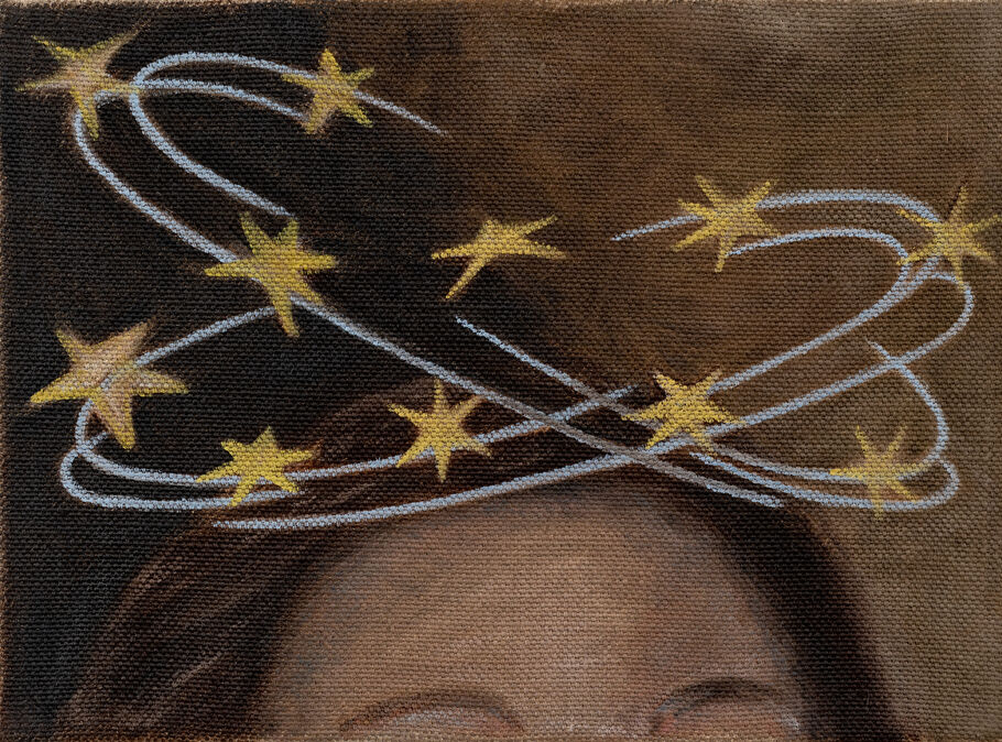 Grace Lee’s curious paintings radiate both whimsy and mystery. The London-based artist’s subjects are wide-ranging, though some motifs run through their work: animals, often in absurd or exaggerated postures; musical instruments; stars. Whatever the subject, Lee—an animator as well as a painter—favors focused, close-cropped compositions that obscure context, prioritizing visually striking snapshots over identifiable narrative. Praised and Confused (2023) typifies their playful, elusive style (including their fondness for wordplay): In murky shades of brown, it depicts a person from the eyebrows up with rings of stars orbiting their scalp, like a cartoon character who’s bonked their head.