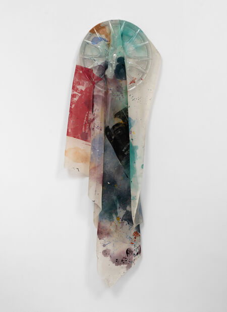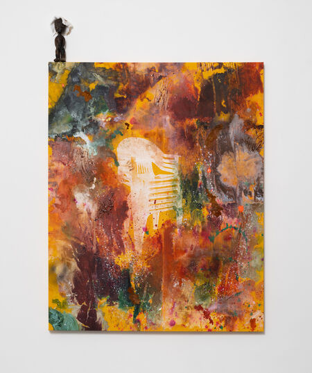 Influenced by artists such as Jack Whitten, Radcliffe Bailey, and Sam Gilliam, Cooper’s work centers around themes drawn from his upbringing. “I want to show a more modern version of Black Southern culture,” he has said. At James Fuentes, Cooper presented lyrically abstract works that alluded to themes of spirituality, sports, cookouts, hip-hop, and more. In Ghost rider (2023), for example, the artist delves into his memories of being taken to car shows as a youth, draping a hubcap with painted voile featuring a silkscreened image of rapper Mike Jones. Formally, the work references the sculptural paintings of Sam Gilliam, while its title recalls a song by the rapper E-40.