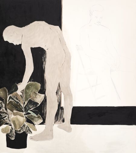 Experiences of queerness and masculinity—sometimes isolating, sometimes intimate—are at the heart of Seiler’s work. In Living Room and Living with Myself (both 2023), figures appear unaware of the onlooker’s gaze. Captured in the nude amid houseplants and furnishings, they seem at home in their surroundings. But a sense of unease lingers: In Living Room, one figure turns his back on the other, while the title of Living with Myself suggests feelings of shame. Other works are simple portraits, titled as such (Portrait 33 or Portrait 34, both 2023). Are their subjects gazing back at the viewer with intensity, or staring into the distance, trapped in their own worlds?