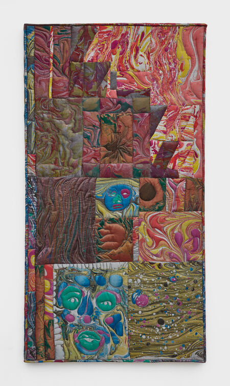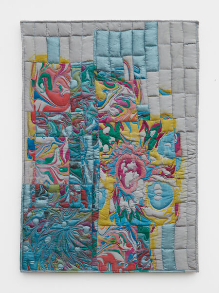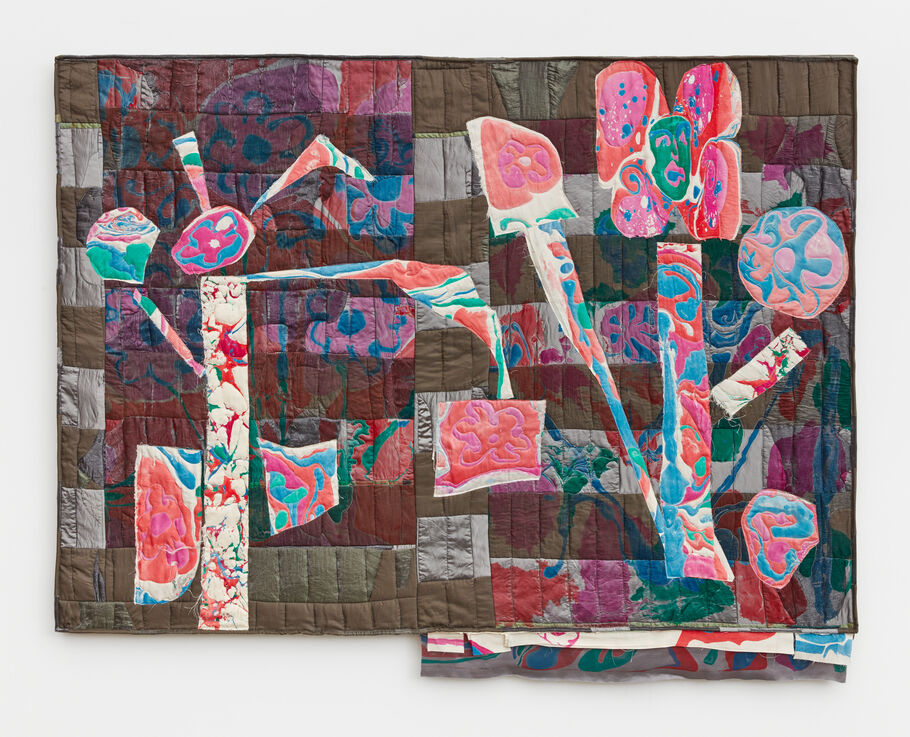 The joint show, titled “Rib Erosion” (a loose jumble of the letters in their names), featured lush quilted works incorporating satin stained with swirling colors, cleverly evoking each artist’s distinctive style. The stunning, collaborative creations are structured similarly to the deftly quilted, wall-hung textiles that form a key part of Libby’s sculptural practice, yet they’re infused with the color-soaked marbling and brushwork found across Rosen’s paintings, textiles, and works on paper.