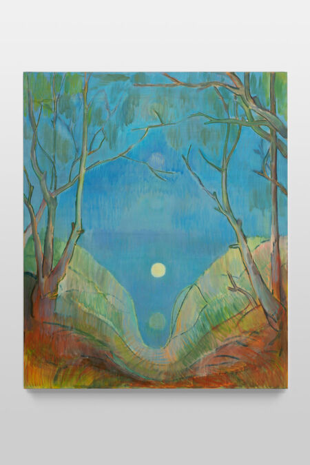 Both works are part of Birchall’s latest solo exhibition at Sullivan + Strumpf in Melbourne, on view through June 10th. Entitled “The Moon Under Water,” the show also suggests another recurring motif in the artist’s work: the rising moon. In the painting from which the show takes its name, Birchall’s signature tree branches reach out against a disarmingly blue sky, where the bright moon hangs, its reflection on the water beneath providing a visual echo. Birchall’s emotionally charged paintings seem to evoke nostalgia for the fleeting moments of beauty they depict—sublime instances of connection with nature.