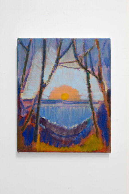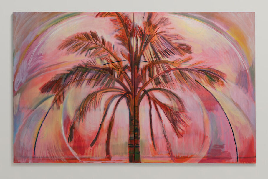 Artists have long created meaning through repetition, drawing out new ideas by iterating on a single subject. For Monet, it was haystacks; for Warhol, soup cans. In the work of Australian American painter Seth Birchall, tree branches receive the same treatment. In Landcare (2023), for instance, two willowy trunks on the banks of a body of water frame a vibrant setting sun, while Memory Leaves Trails, Patterns, Edges, Walls, Bottoms and Chasms (2023) uses the same gestural, feathery oil technique to portray the crown of a palm tree in sunset pinks and oranges.