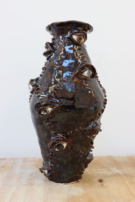 The artist’s brilliance is similar in her more abstract works. In Bursting at the Seams (2021), bulging eyeballs protrude unexpectedly from the delicate, reflective surface of the glazed ceramic—a playful, grotesque interpretation of the traditional vessel.