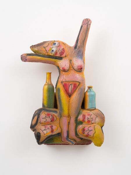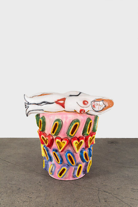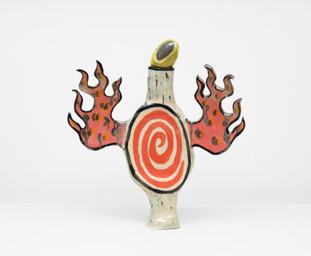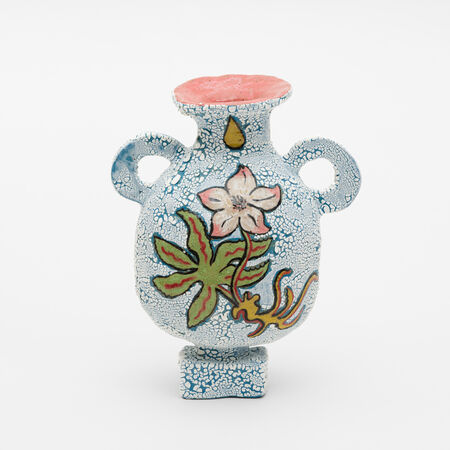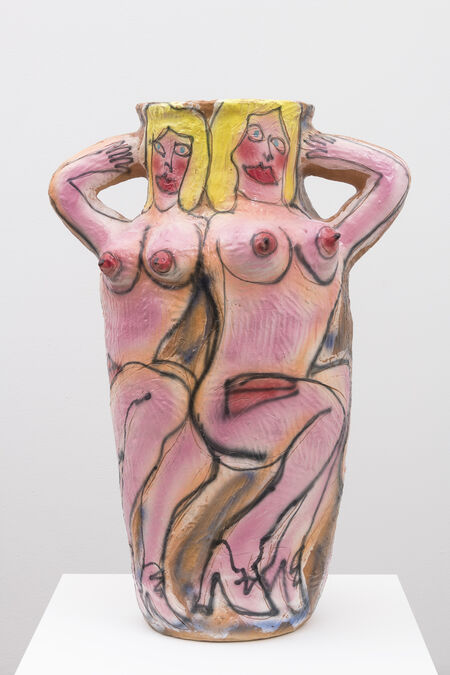 Untitled (2018), for example, speaks to the artist’s nontraditional technique. A misshaped ceramic vase is anthropomorphised into the naked figures of two women, their lips and nipples rouged, akin to a Schiele nude. By applying spray-based glazes onto her pieces, Neri combines the effervescent effect of watercolor with the solidity of a decorative vessel.