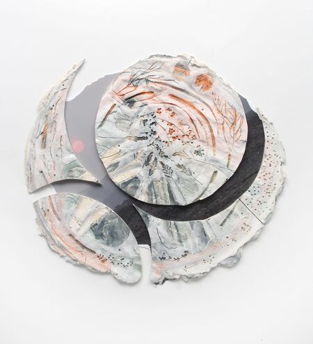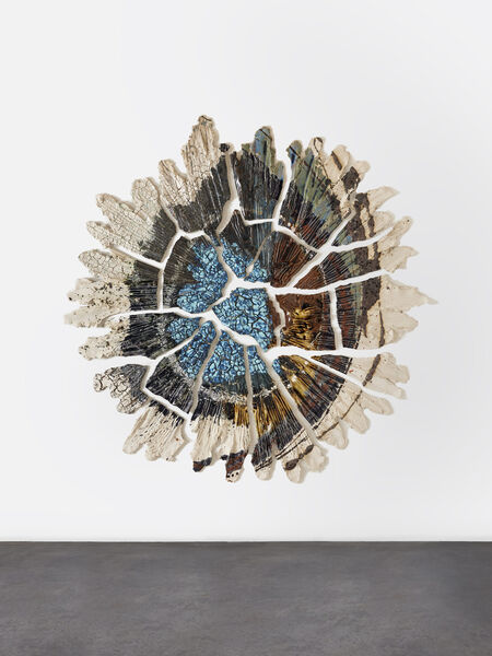 The tactile imprints which form the limbs of Ruais’s sculpture deliberately recall the artist’s movements while mining for materials in a clay quarry, recorded in the triumphal video art piece Diggin in, Digging Out (2021). Engaging, embedding, and emerging from the wet, raw earth, the artist then repeats these excavation marks in the studio, impressing her exact body weight into foraged clay. The marks of the artist’s clawing hands are then fired and painted, as in Spreading Outward from Center, Blue Eye (2022). These intensely expressionistic, wall-mounted pieces portray the future and cross-medium potentiality of clay work.