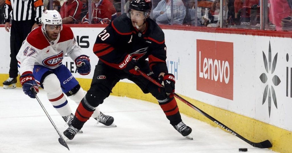 Less than 2 1/2 minutes after Hall gave the Hurricanes the lead, Jarvis skated up the left side and saucered a cross-ice pass over the stick of sliding Canadiens defenseman Alexandre Carrier to Aho, who redirected it up over the Montembeault’s glove to make it 3-1.