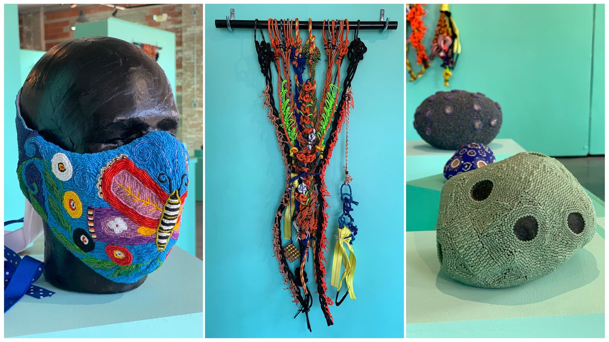 Photographer Jacinda Davis is planning to visit the Hutchinson Center for the Arts to see the new exhibit “Malaise” by fiber artist Liz Miller and beadwork artist Chris Allen. The title of the show reflects the uncertainty of the times, but Davis says she finds the bright colors of their work energizing. Liz Miller uses knotted ropes to make large sculptures, while Chris Allen’s fine beadwork creates textures on a smaller scale. The show runs through Nov. 13.