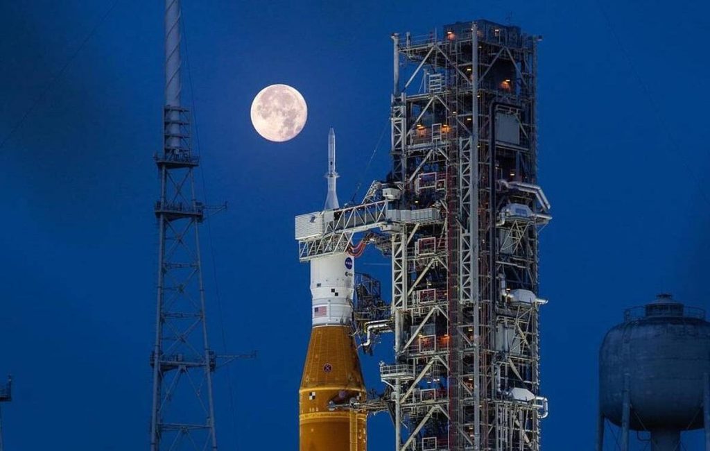 A full Moon is in view from Launch Complex 39B at NASA’s Kennedy Space Center in Florida on June 14, 2022. The Artemis I Space Launch System (SLS) and Orion spacecraft, atop the mobile launcher, were being prepared for a wet dress rehearsal to practice timelines and procedures for launch.