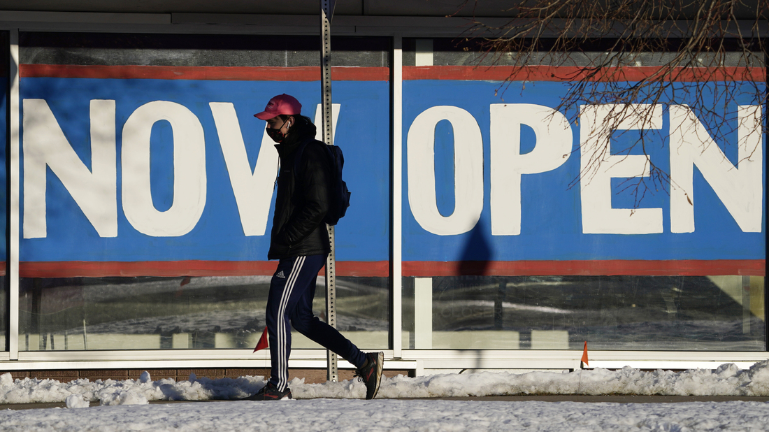 A pedestrian on Feb. 25 walks past the window of a restaurant with a sign promoting its re-opening in Boulder, Colo. Congress on Wednesday passed a $1.9 trillion stimulus plan, which is expected to provide a strong boost to economic growth.