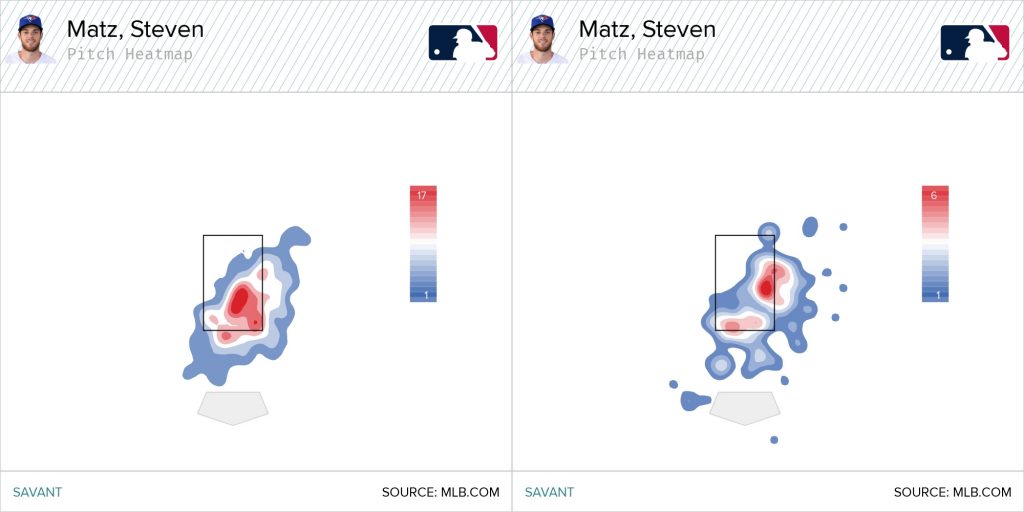But through the season’s middle months, Matz’s changeup — his curveball, too — was landing more towards the middle of the zone than the edges, which made it easier for hitters to fight off while setting their sights on his fastball, which was coming at them in a similar location. But since a rough outing on July 28 when he allowed five hits on his sinker, Matz appears to have rediscovered the feel for his changeup, throwing it more consistently towards the bottom of the zone and the outside edge, which has helped make his other pitches more effective.