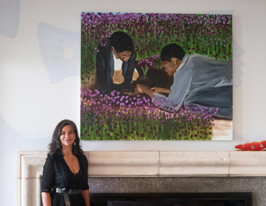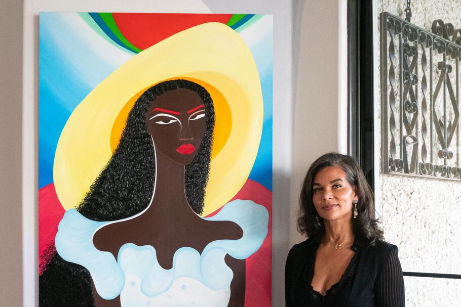 Suzanne McFayden with a painting by Bony Ramirez. Photo by Olivia Frierson. Courtesy of Suzanne McFayden.