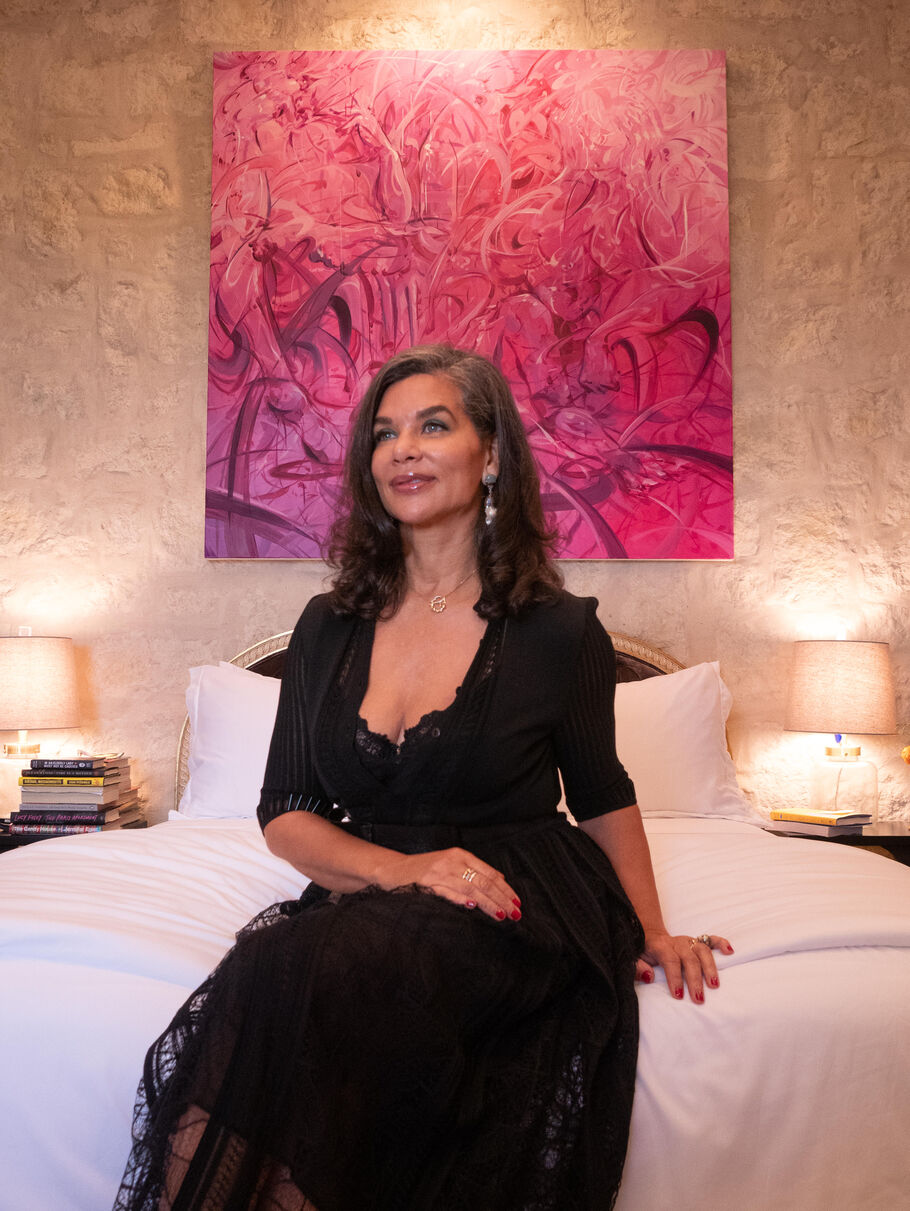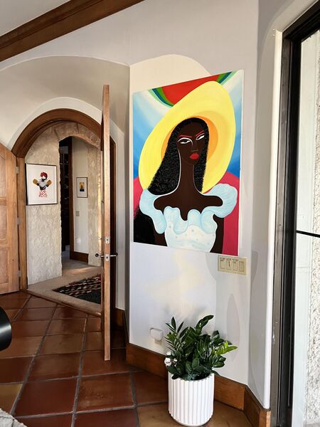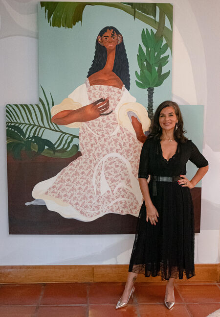 Suzanne McFayden with a painting by Delphine Desane, hung on a mural by Diego Miro. Photo by Olivia Frierson. Courtesy of Suzanne McFayden.