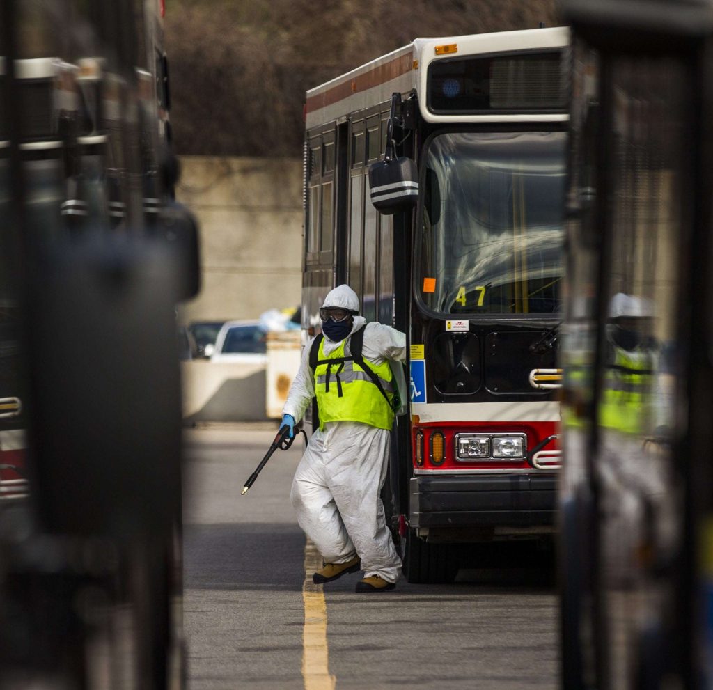 A worker in a protective suit inside a bus at the Toronto Transit Commission – Queensway Garage – on Evans Ave. near Kipling Ave. in Toronto, Ont. on Thursday April 16, 2020.