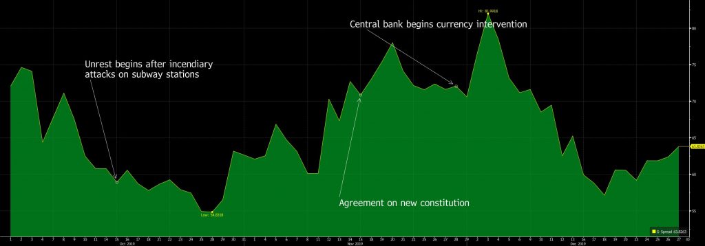 While the economy has taken a hit from the protests, with economic activity contracting 5.4% month-on-month in October, market confidence has been recovering. The peso has strengthened 11% since Nov. 28 when the central bank announced an intervention, the best performance of any emerging-market currency.