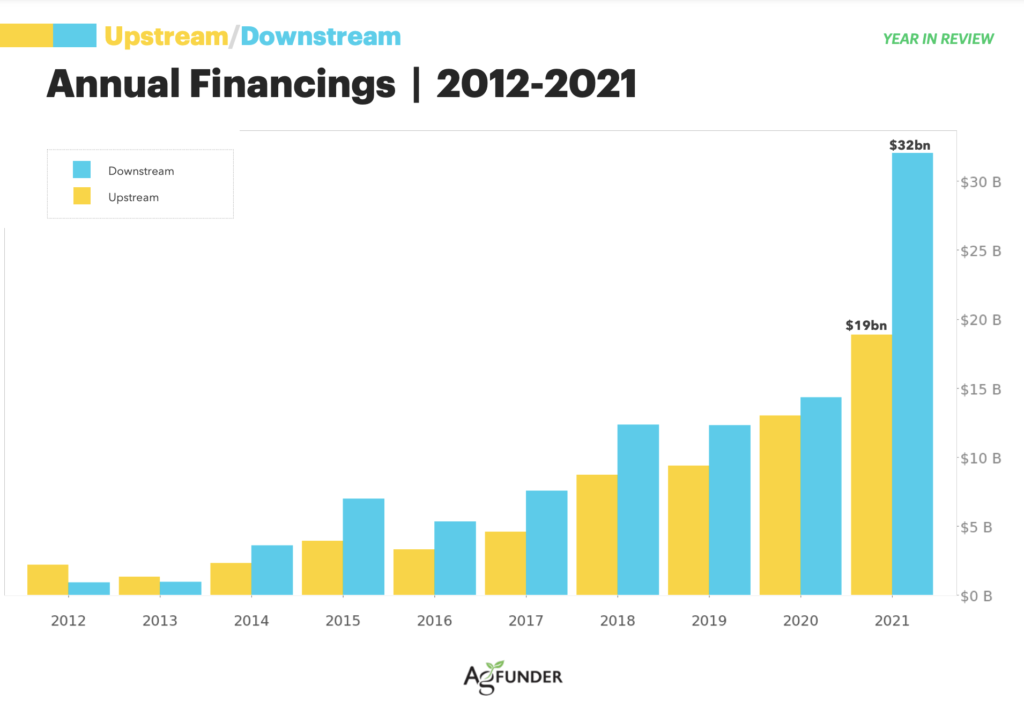 Downstream agrifoodtech investments surpassed upstream investments in 2021, increasing 124% YOY to $32 billion compared to upstream’s $19 billion, according to AgFunder’s latest annual Agrifoodtech Investment Report.