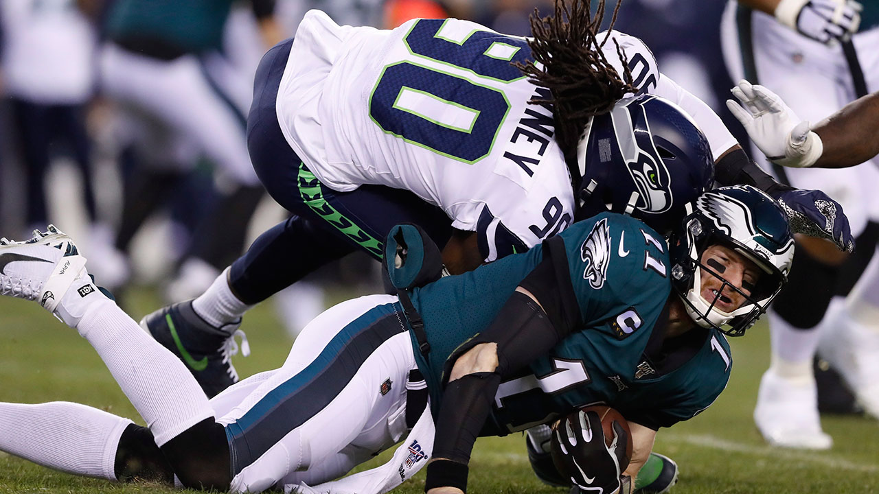 Wentz was speared in the back of the head on a helmet-to-helmet hit from Seahawks defensive end Jadeveon Clowney — a bang-bang play that boarded on flagrant — and was knocked out of the game with a severe head injury.