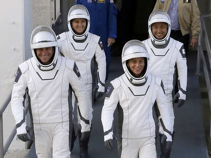 SpaceX astronauts, from row from left, Josh Cassada, Nicole Mann, second row from left, Russian cosmonaut Anna Kikina, and Japan Aerospace Exploration Agency astronaut Koichi Wakata leave the Operations and Checkout building before heading to Launch Pad 39-A at the Kennedy Space Center in Cape Canaveral, Fla., for a mission to the International Space Station Wednesday, Oct. 5, 2022. (AP Photo/John Raoux, File)