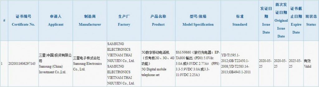 A variant of the Galaxy Note 20+ (SM-N9860) has passed through the CCC (China Compulsory Certificate) certification process, revealing support for 5G networks and 25W (9V/2.77A PD or 11V/2.25A PPS) fast wired charging. The phone’s charging was tested using Samsung’s EP-TA800 charger, which supports USB-PD and PPS.