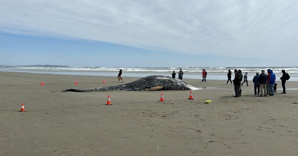 Parks Canada says in a statement that its staff and Tla-o-qui-aht Tribal Park guardians were on scene as the whale came ashore.