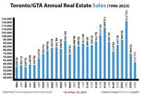 Graph showing total annual residential real estate sales in Toronto and the GTA between 1996 and 2022 compared to sales to date as of Nov. 30, 2023.