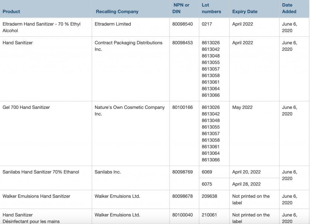 The industrial-grade ethanol in the products contains impurities that are not found in the type of ethanol that’s usually used in hand sanitizers, Health Canada said in an advisory posted Saturday.