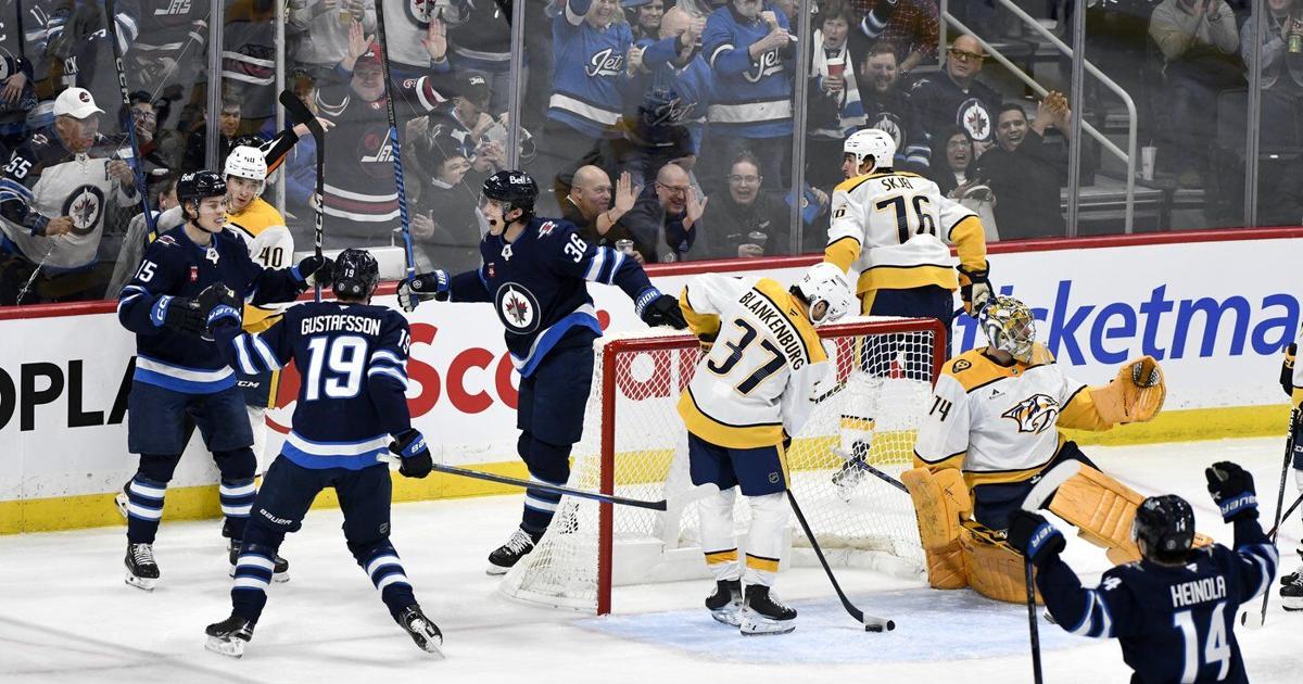 WINNIPEG – Morgan Barron and Josh Morrissey scored 16 seconds apart to help Winnipeg Jets goalie Connor Hellebuyck record his 300th NHL career win with a 5-2 decision against the Nashville Predators on Tuesday.