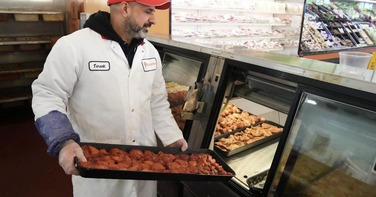 But this isn’t just any grocery store. Walk past the produce and the olives, and you’ll see trays of tabbouleh, hummus and fattoush, as well as shawarma cooking on rotating spits. Further, you’ll find a large dessert section with neat displays of golden baklava and other sweets. Behind two swinging doors, rows of puffed-up pita bread emerge on a conveyor belt from the oven, ready to be packaged and sold to customers.