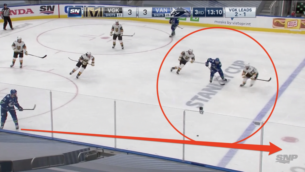 Finally is an instance where a team just seems like they’re forcing it, trying to make something happen when it isn’t there. The score is 4-3 Vegas now (“let’s go get one”), it’s an O-zone draw (“let’s go get one”), Vancouver has two more offensive-leaning defencemen out there (you get the point). But trying to make a move at the blue line against perennial Selke-nominee Mark Stone isn’t the offensive aggressiveness the Canucks are looking for from their defencemen. There’s nowhere to go even if they get by Stone. Just put it in deep and let Brock Boeser, Bo Horvat and Miller get to work.