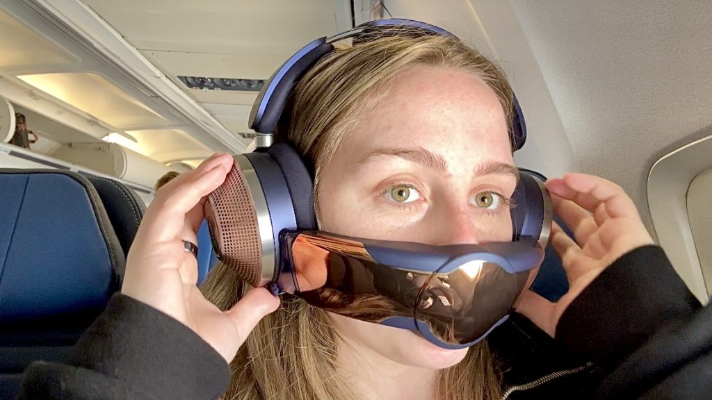 But in the confines of the coach section, getting the Dyson Zone system out of my bag proved a struggle. Not only is the device a hefty 1.47 pounds with the visor, but the visor doesn’t stay attached if the headset gets bumped around. Juggling my iPad, water bottle and neck pillow, the Dyson Zone certainly didn’t grant me grace.