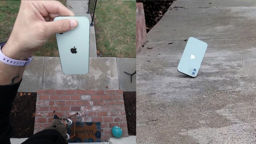 We repeated this drop two more times hoping it would at some point land flat on its face, but the weight of the camera made it hard for it to land at that angle, especially at that height. The iPhone 12 finally landed with the screen down on the last drop, but only because it bounced off the side of the porch step. The frame had a few more bumps and bruises, but the screen still looked like new after three back-to-back drops from nine feet. The only way up from there would’ve been to climb up on the roof or rent a scissor lift, which we weren’t exactly prepared to do.