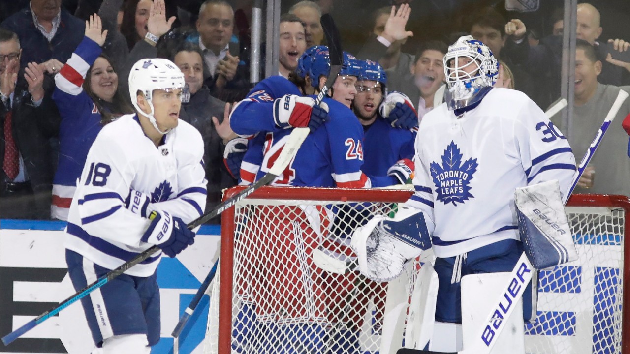 That fourth New York Rangers goal was particularly tough for Hutchinson, who lost his stick and never got into a set position before seeing Pavel Buchnevich’s shot get through him. He’s been under the spotlight in Toronto ever since Frederik Andersen went down with a neck injury on Monday and won’t silence his critics after this 5-3 loss.