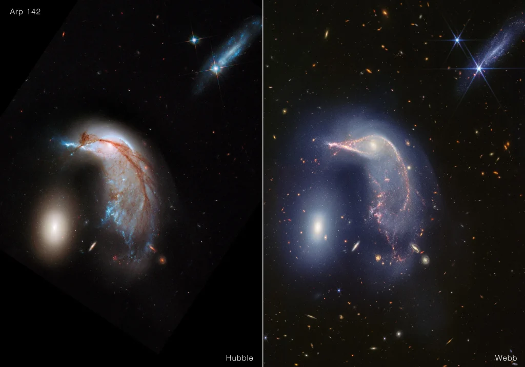 Hubble’s view of Arp 142 from June 22, 2012 (left) is shown next to Webb’s new look, captured on May 6, 2024 (right). (NASA, ESA, CSA, STScI)