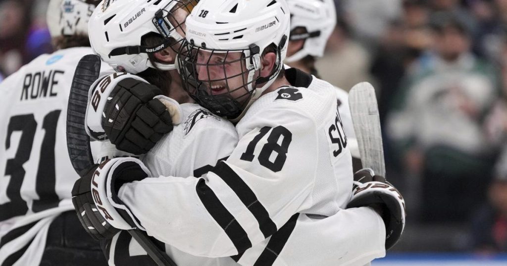 Jared Wright, with the tying goal with 2:39 left in regulation, and Aidan Thompson scored, and Matt Davis had 44 saves for Denver (31-12-1). The Pioneers, who have won a tournament-leading 10 titles and two in the previous three years, failed in their bid to become the NCAA’s ninth team to repeat as champions, and first since Minnesota-Duluth in 2018 and 2019.