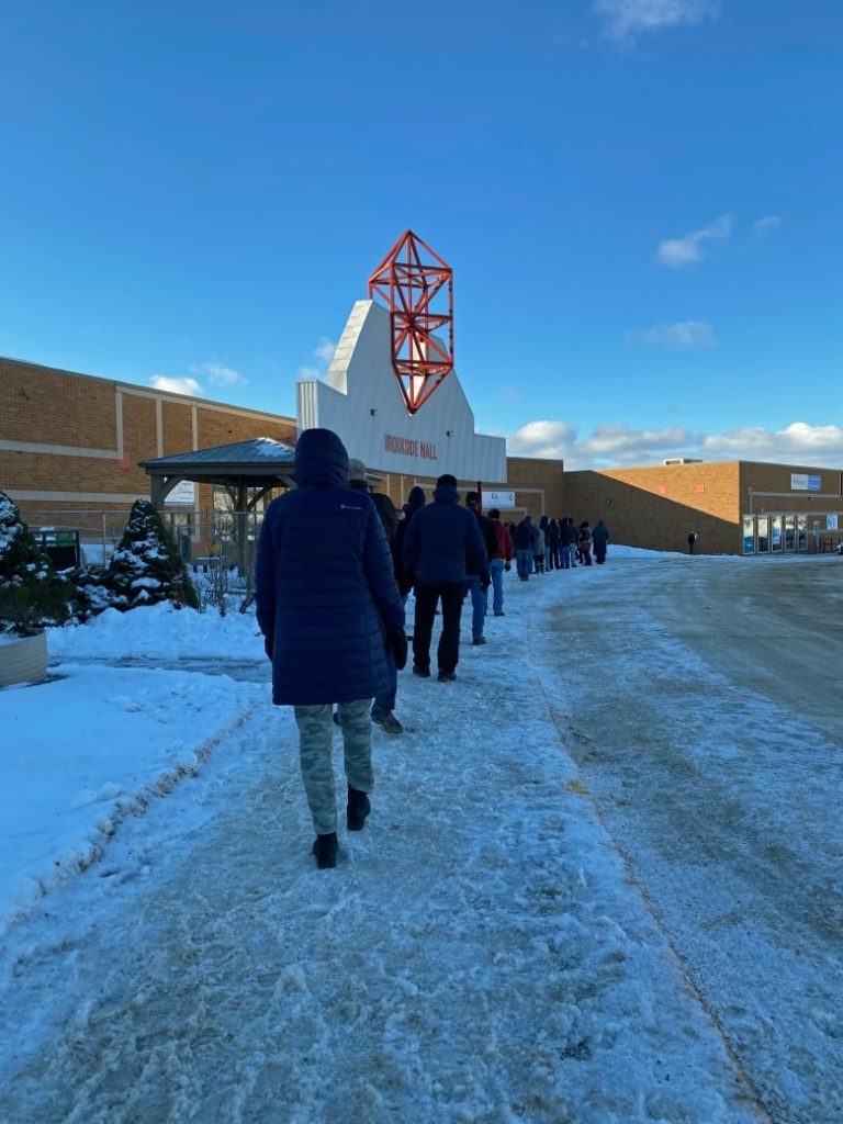 At the Brookside Mall clinic, volunteers are handing out masks and asking people to “double up,” putting the masks on over their existing ones, even if they were wearing an N95 or KN95.