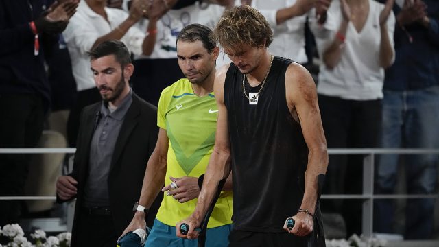 Zverev then was taken off the court in a wheelchair. Several minutes later, he came back out using crutches and said he needed to retire from the match. He shook the chair umpire’s hand and then hugged Nadal.