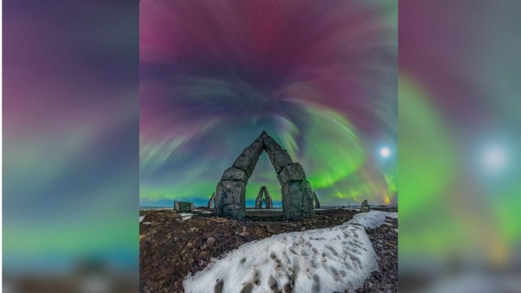 The image is set at the peaks of the iconic Arctic Henge in Raufarhofn in northern Iceland and it shows the aurora-filled sky aligned with various other stars. It says, “Some are lined up toward the exact north from one side and toward the exact south from the other.”