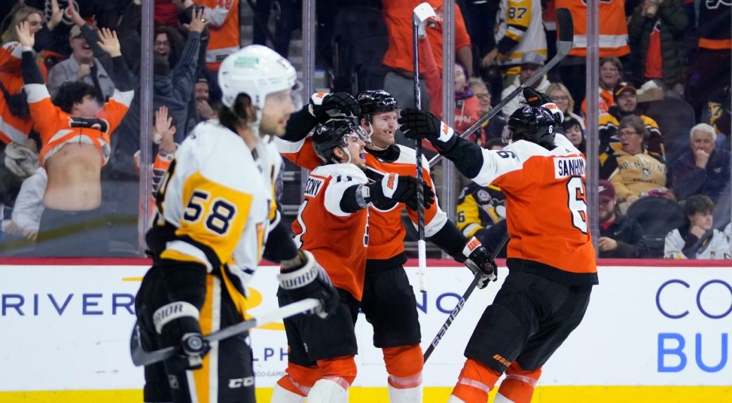 Sidney Crosby became Pittsburgh’s all-time leading scorer against the Flyers when he tallied late in the first period.