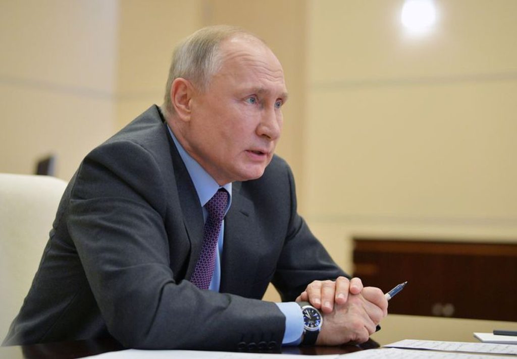 Russian President Vladimir Putin attends a meeting on global energy markets via a video link at his residence outside Moscow, Russia, April 3, 2020.