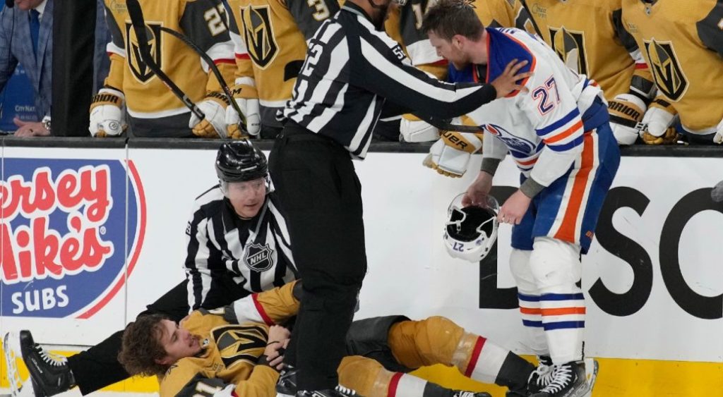 The after-whistle extra-curriculars began late in the second period when Vegas’ Brett Howden and Edmonton’s Brett Kulak fought each other, with the Golden Knights’ Keegan Kolesar and Oilers’ Evander Kane coming together at the same time. In that scrum, Kane toppled Kolesar to the ice and gave the forward some quick body blows. That aggression earned Kane four minutes for roughing while Kolesar was given two minutes for the same infraction.