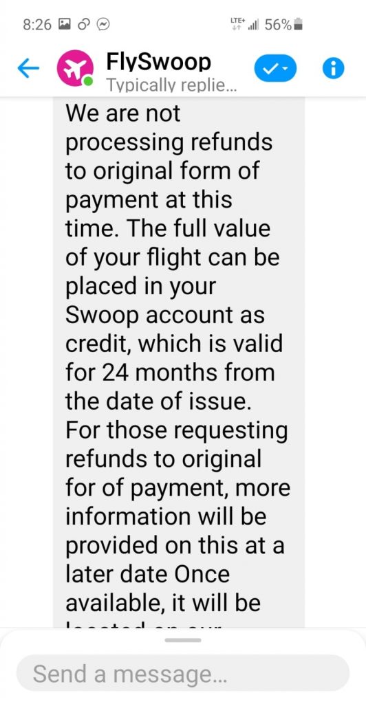 “I spent 2.5 hours on hold in order to speak with someone direct,” she explained. “[The customer service representative] says at this time Swoop does not have a policy in place to issue refunds as a result of COVID-19, and she says ‘well you can check back in the future and that may be an option.'”