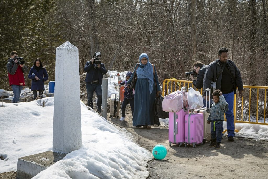 A group of four migrants (presumably a family, but unconfirmed) arrive at the unofficial border crossing point at Roxham Road in Quebec, on Feb. 24, 2023.Roger Lemoyne/The Globe and Mail