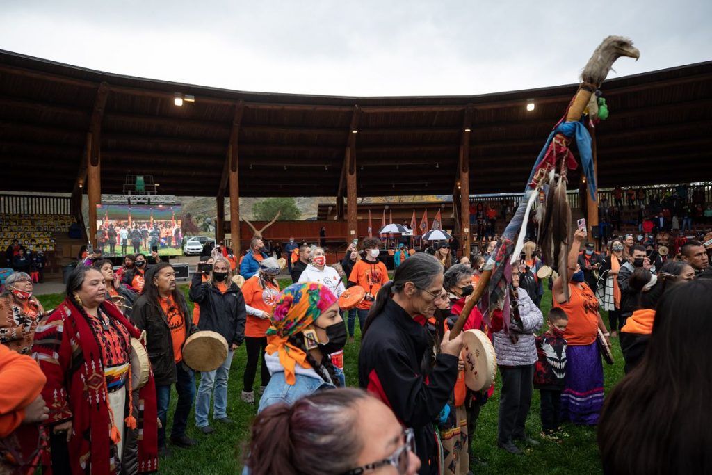 People listen as drummers begin to play after a moment of silence during a Tk’emlúps te Secwépemc ceremony to honour residential school survivors and mark the first National Day for Truth and Reconciliation, in Kamloops, B.C., on Thursday, Sept. 30, 2021.