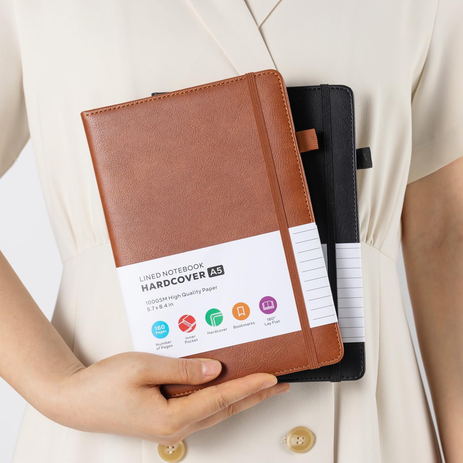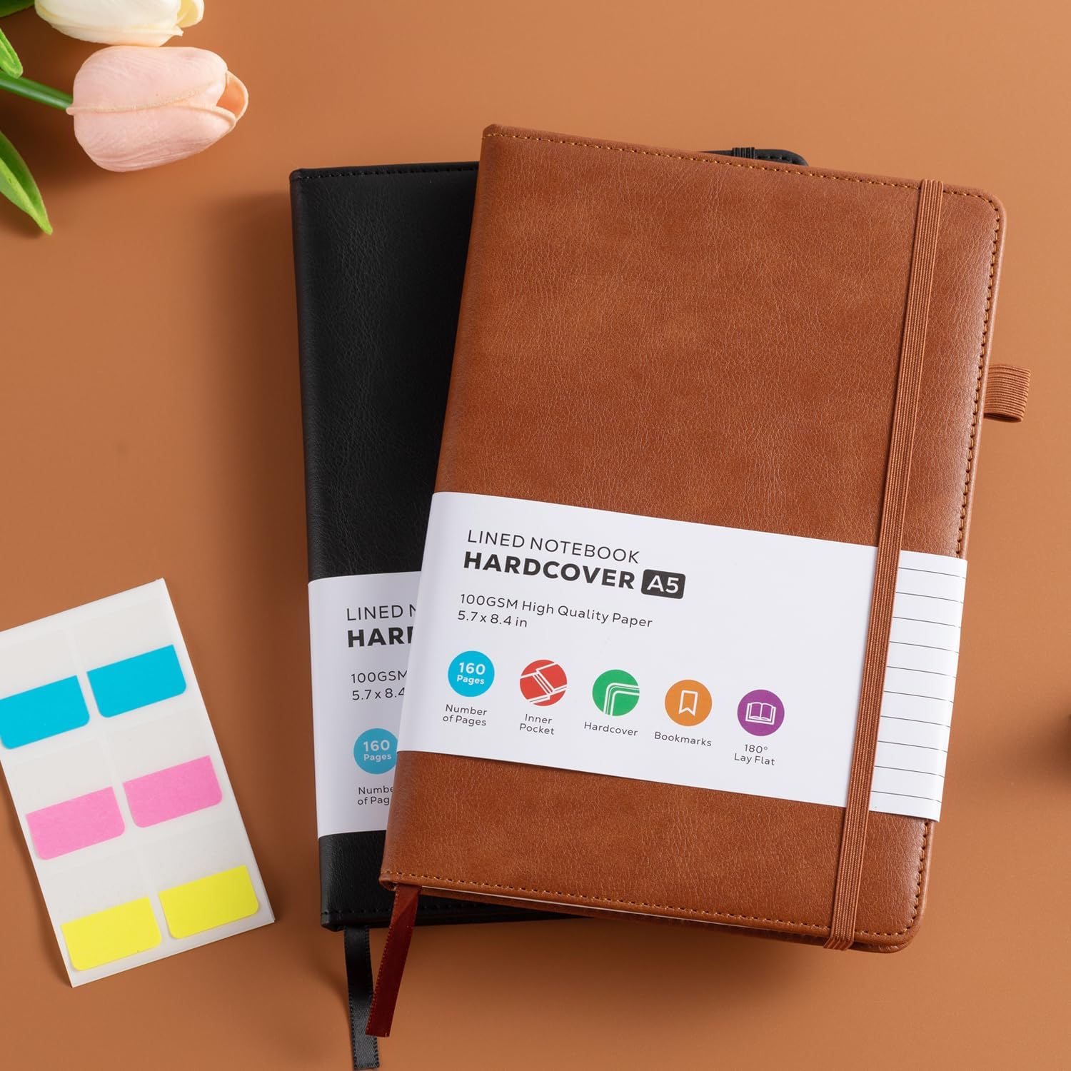 Hardcover Journal Notebook – 2 Pack A5 lined notebooks journals, medium 5.7″x8.4″, easy to carry. Each notebook has 160 pages, 2 books have 320 pages in total, 7mm space classic college ruled notebook, double-line binding will not crack. The notebook journal comes with a pen loop, ribbon bookmark, inner pocket, and elastic band. Each leather journaling notebook comes with 1 multi-color index label sticker.
