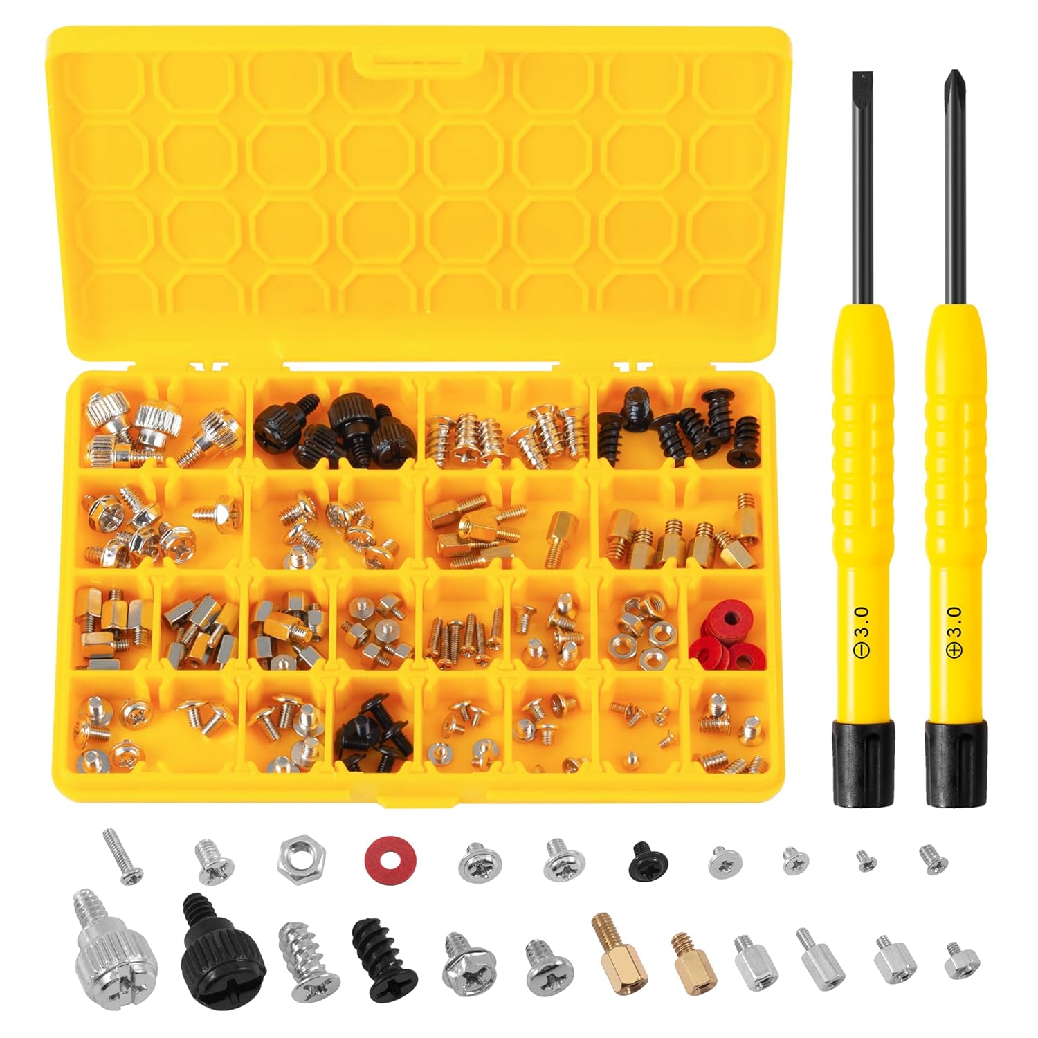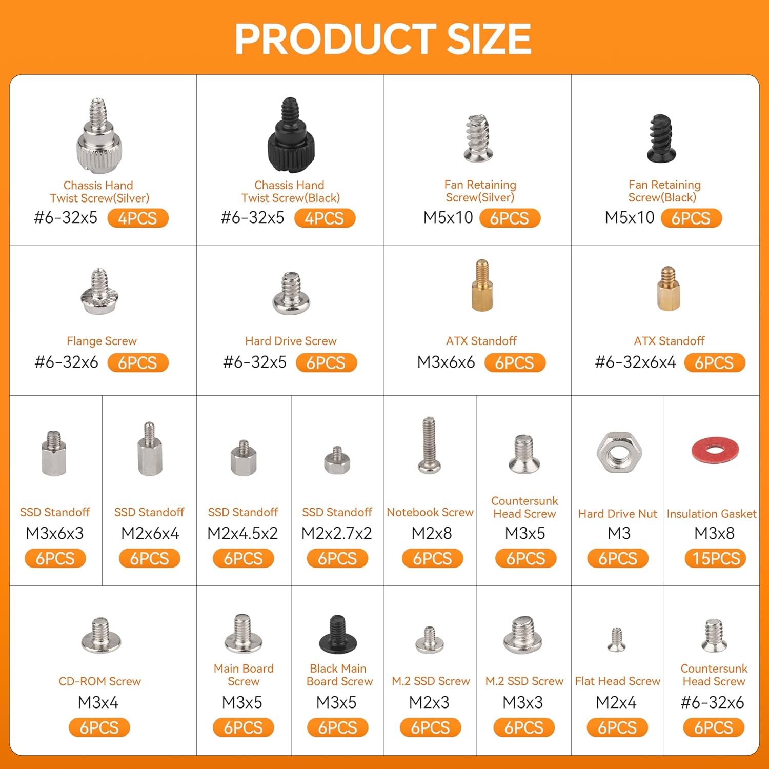 【Complete & Exquisite Box】: Total 23 different computer screws with 150pcs in a box, each size of screw is placed inside a compartment and clearly labeled, easy to distinguish, meet all your needs. The 150PCS screws kit contains a variety kind of screws to help you find the right one for PC building & repair needs. Besides, the sizes chart clearly on the box can help us find the exact screw we need.