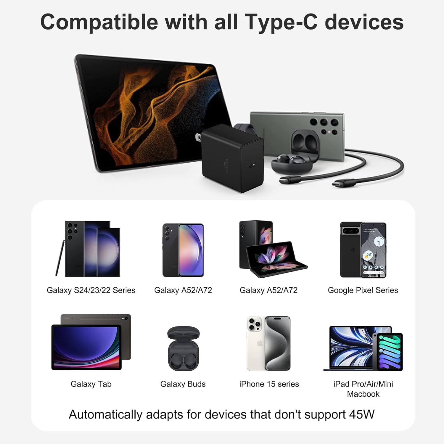 What You’ll Get: 2 x 45 Watt USB C Charger Adapter, 2 x 10ft USB C to USB C Cable. Our 45W USB-C Charger is the perfect Type C charger fast charging for Galaxy S24 Ultra and other USB-C devices