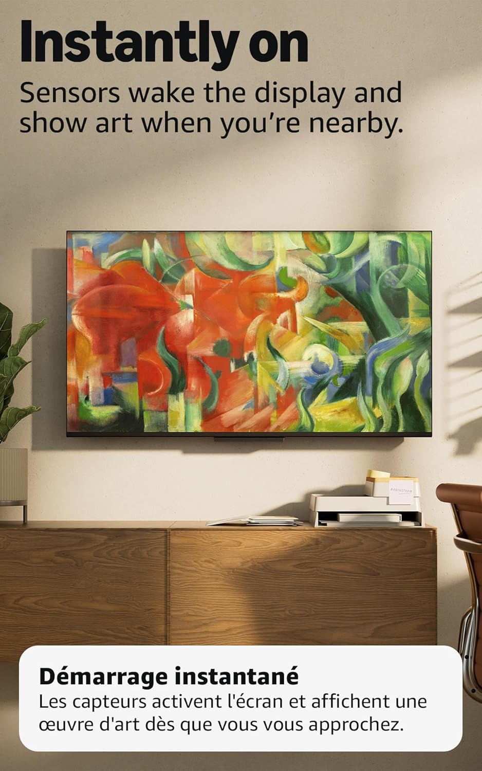 Instantly On – Introducing our custom Omnisense technology. Built-in sensors wake the display when you enter to show your favorite artwork or let you start watching in a snap.