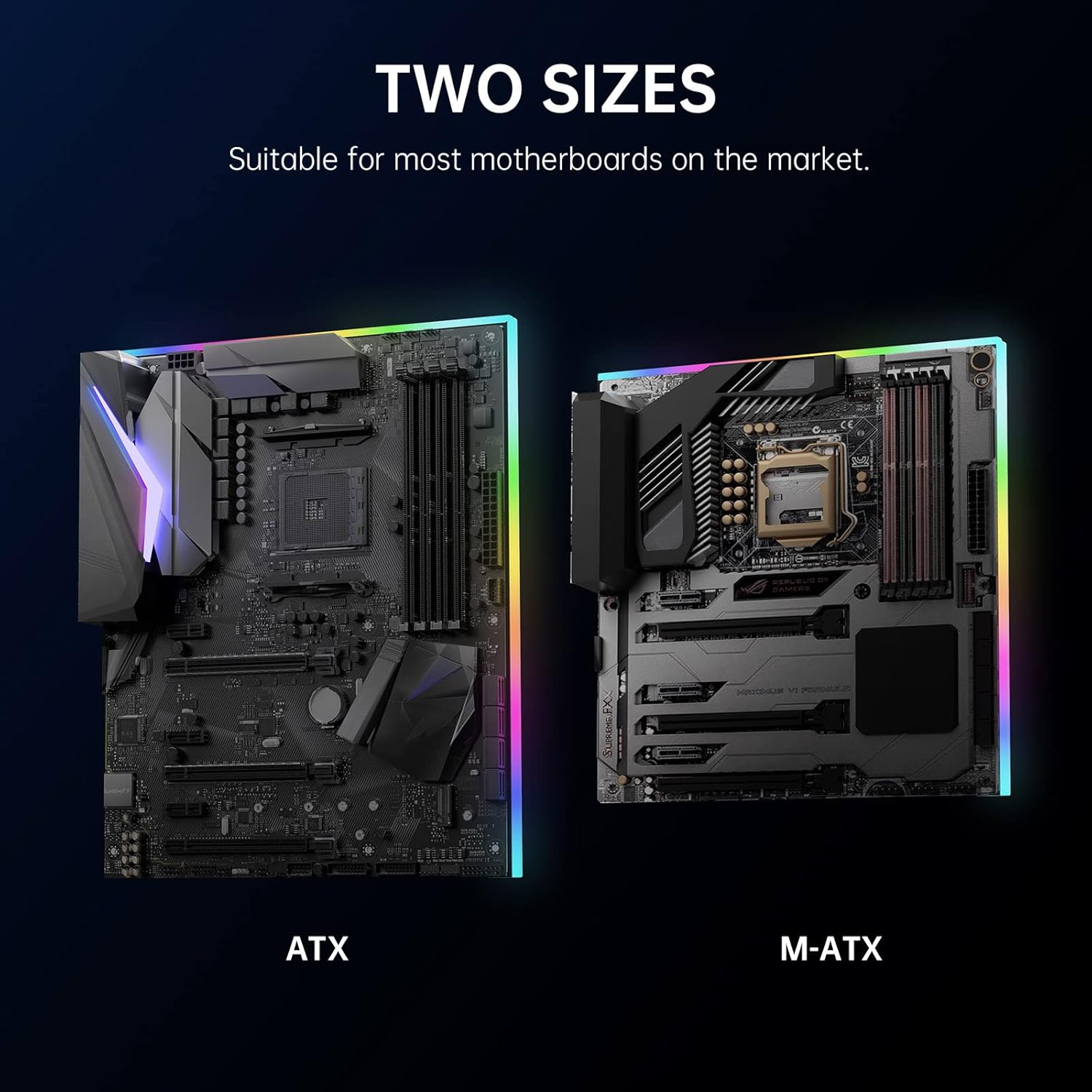 Easy Installation: No extra tools needed. Step 1: Place this pc led strip on standoffs; Step 2: Insert this pc led lights to the motherboard, Step 3: Screw down. Package list: 2 * addressable rgb pc led strip, both in 9.4inch length, suitable for mATX computer case.
