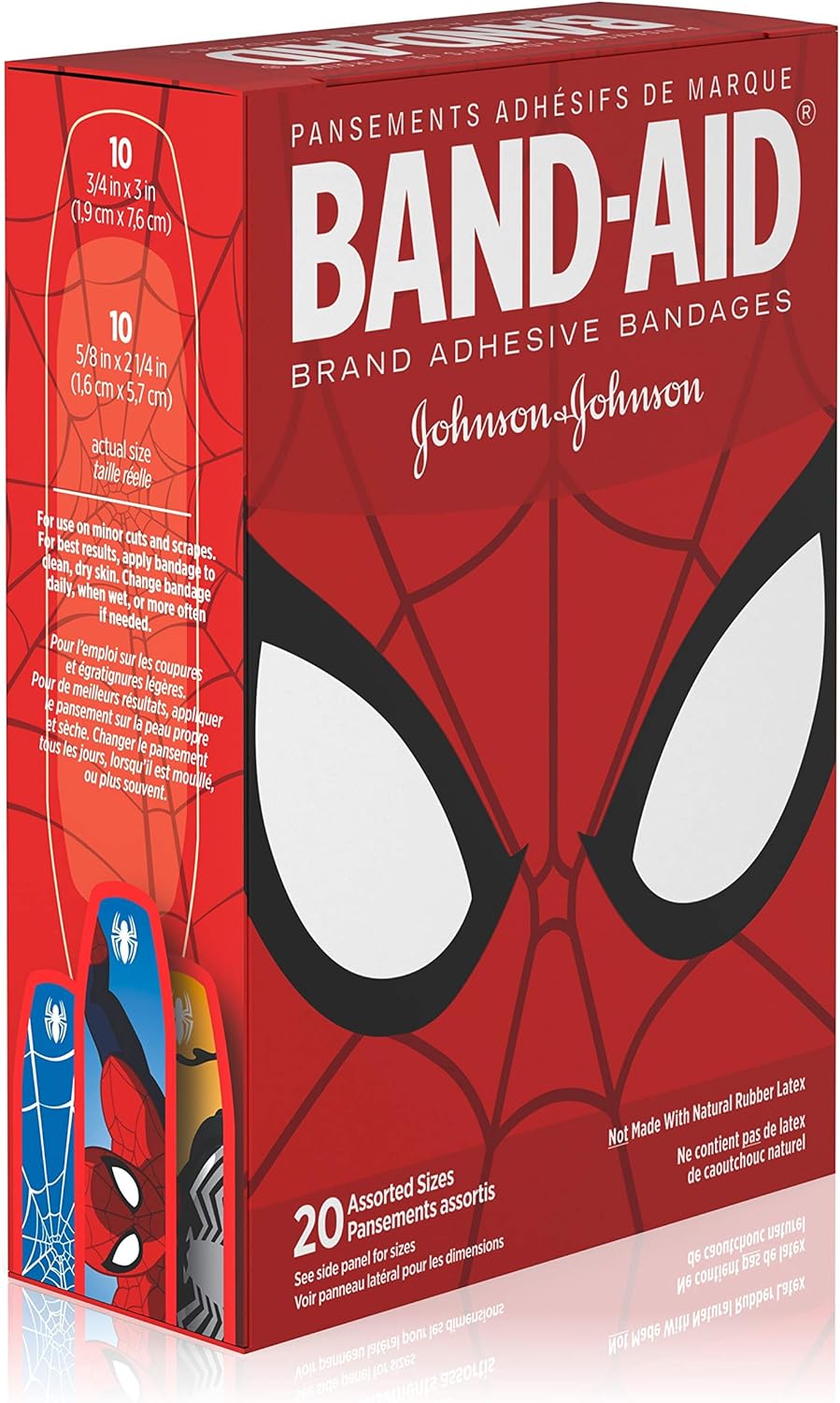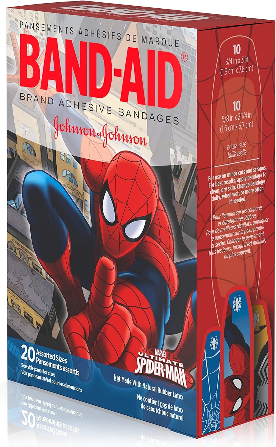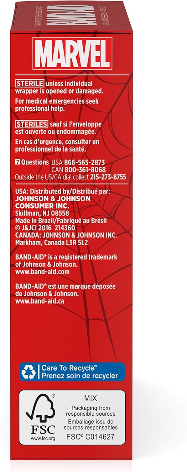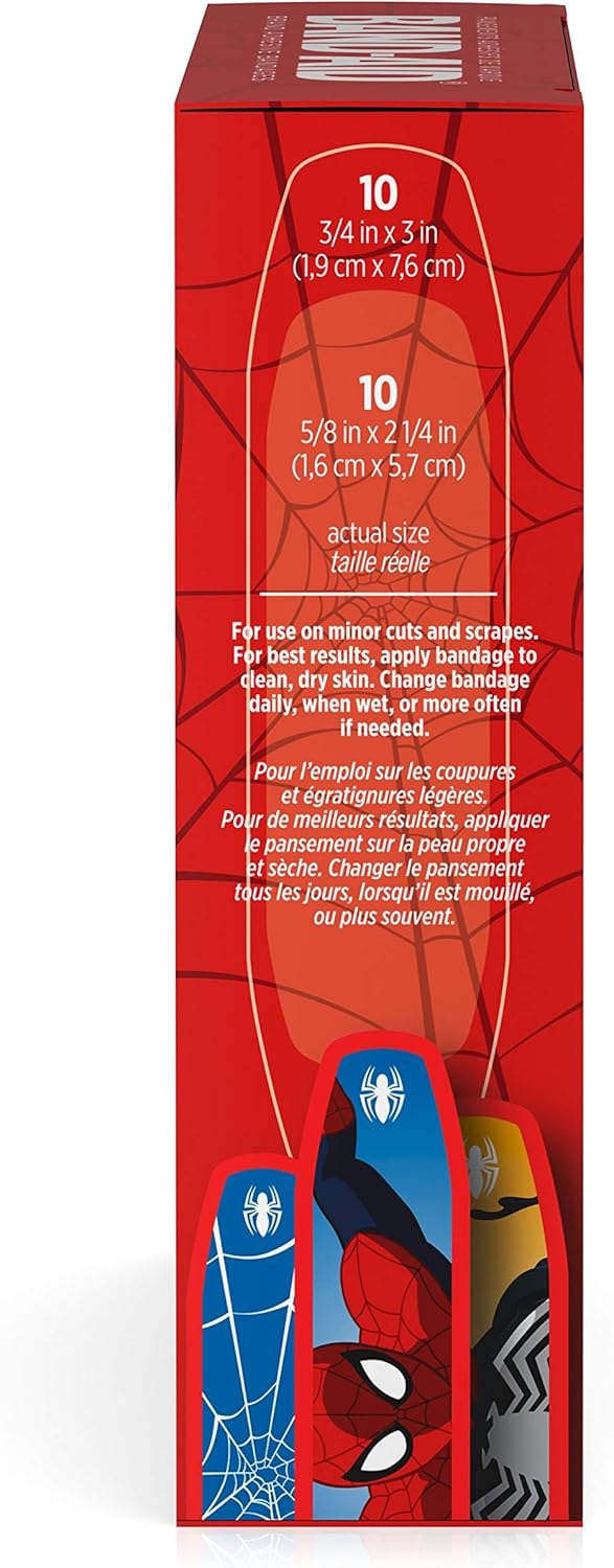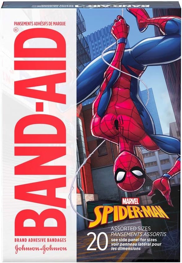BAND-AID Brand Adhesive Bandages featuring MARVEL Spiderman cover and protect minor cuts and scrapes with fun MARVEL Spiderman graphics. These sterile bandages come in assorted sizes with designs that include Spiderman and others. BAND-AID Brand Adhesive Bandages stick to the skin, not the wound. This package contains 20 sterile bandages in assorted sizes suitable for small wounds.