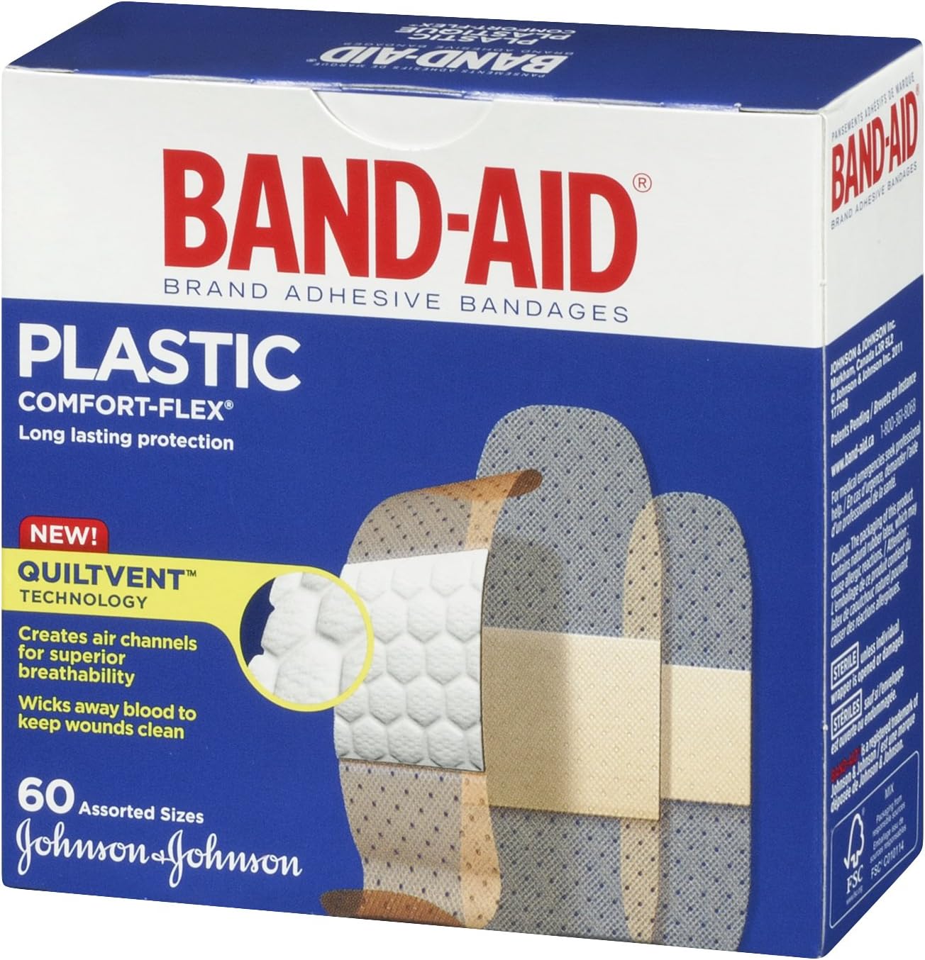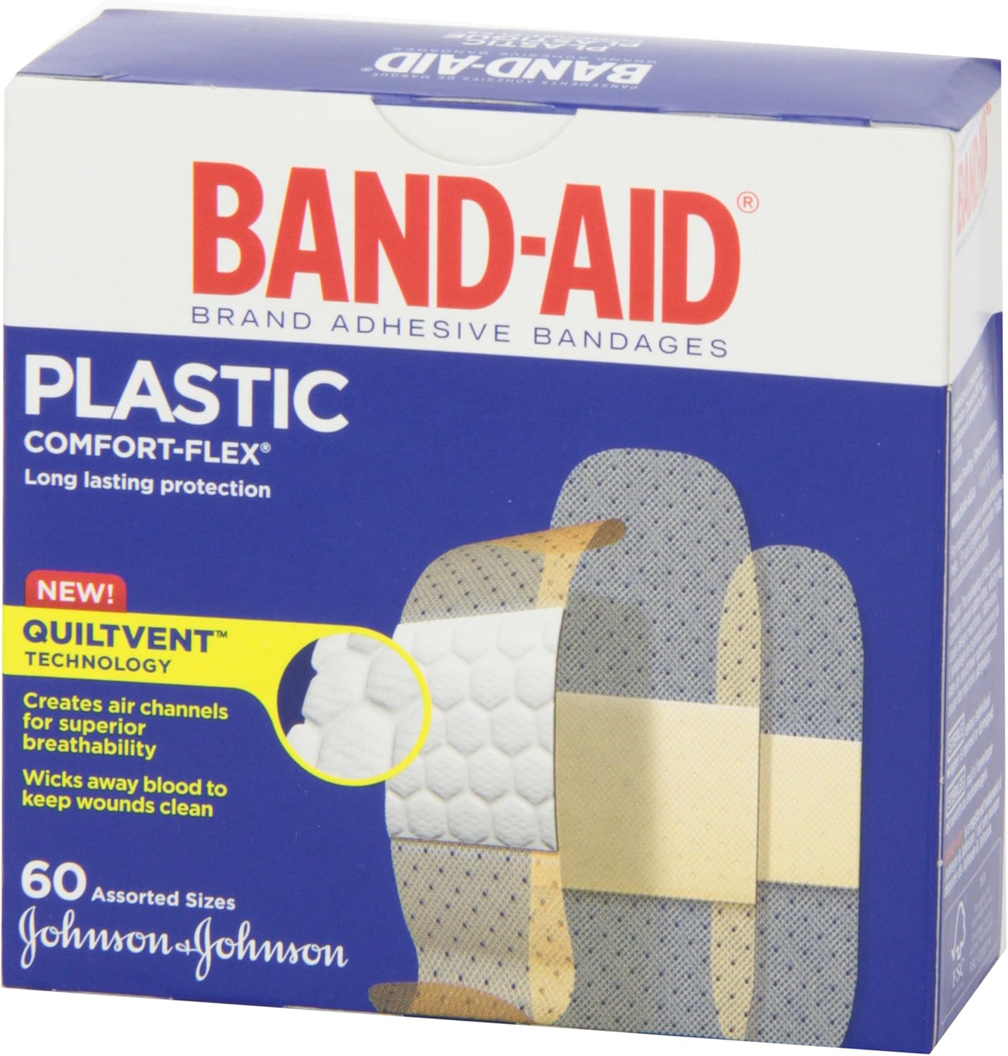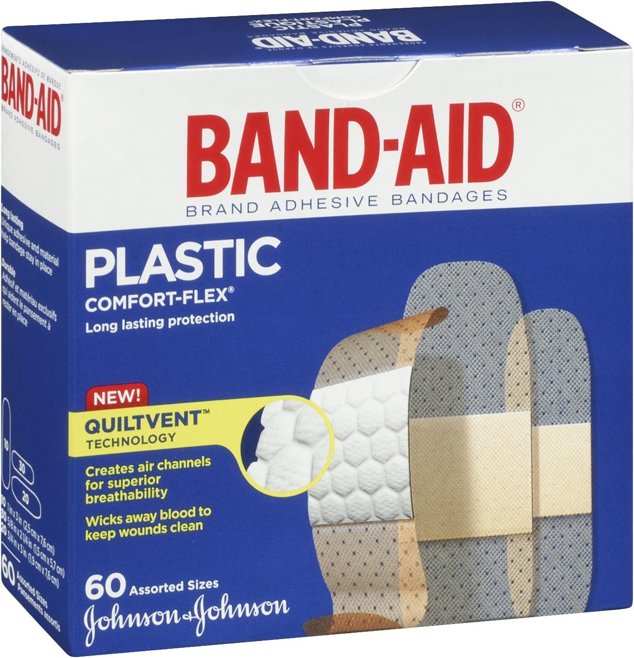 Band-Aid comfort-flex assorted strips bandage family pack. Comfort-flex bandages provides greater comfort and flexibility, so bandages stay on longer and provide the protection you want. Bandages are all purpose. Made of plastic material. Also gives breathable protection for everyday cuts and scrapes. Includes 60 bandages per pack.
