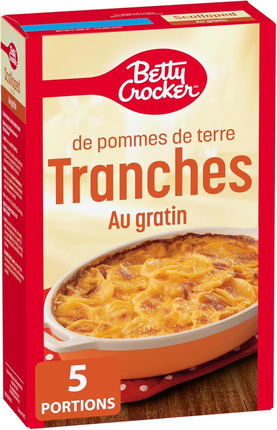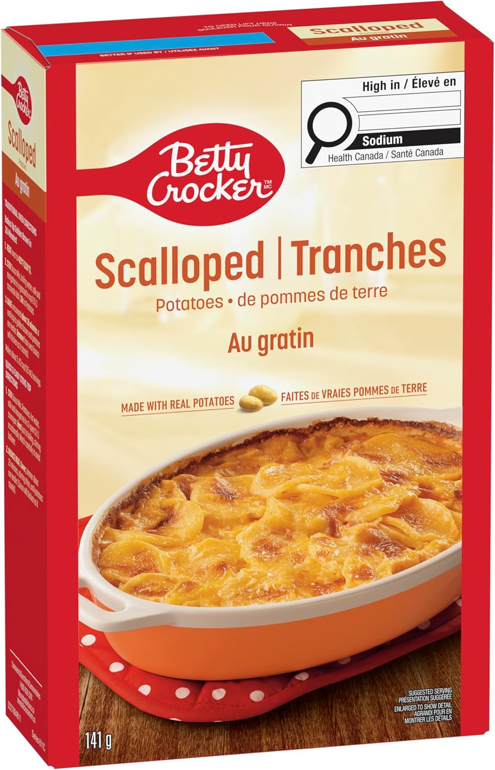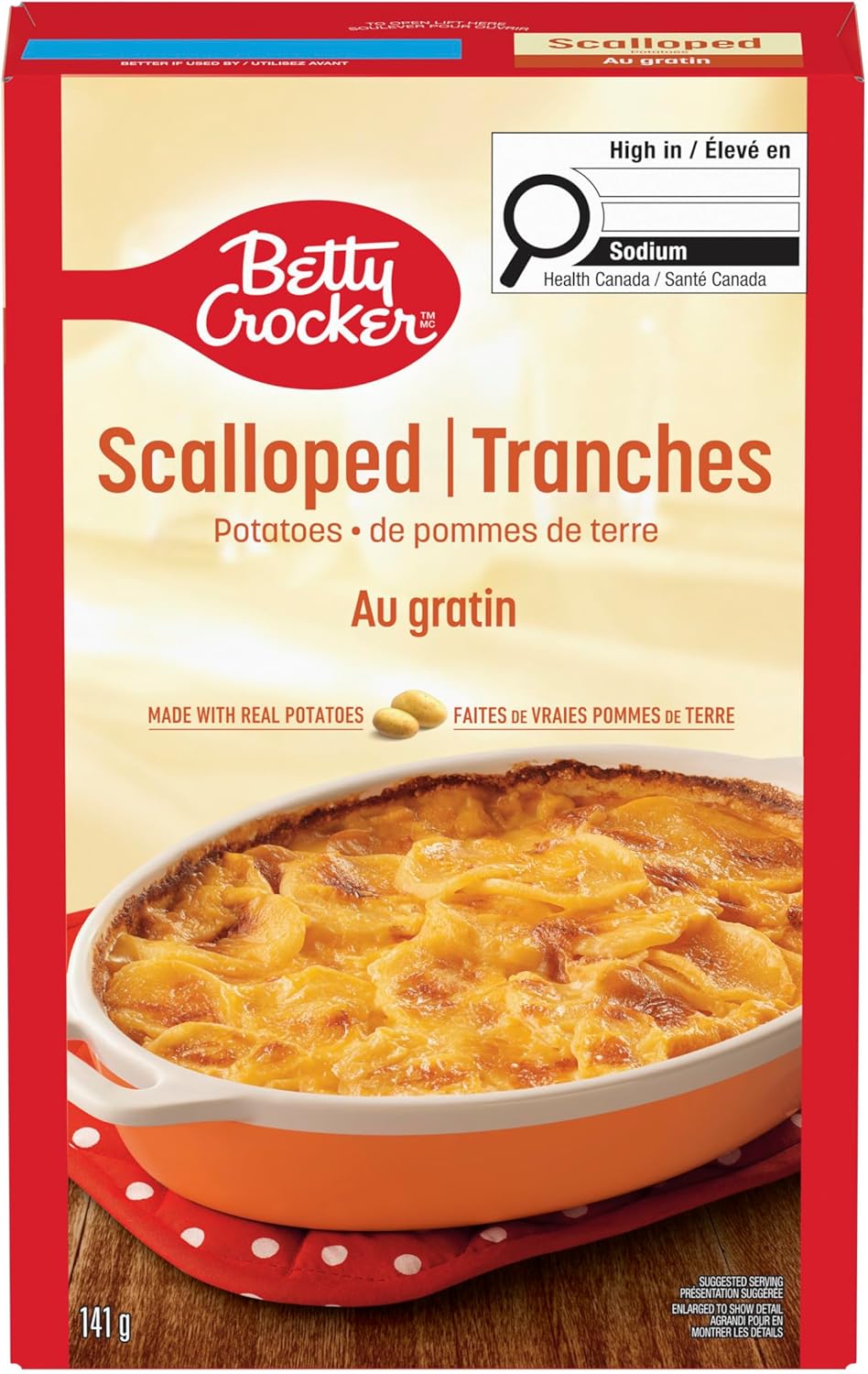 Introducing Betty Crocker Au Gratin Scalloped Potatoes – a timeless classic potato side dish that is sure to delight the taste buds of your entire family. Made with 100% real potatoes and seasoned with a creamy, cheesy sauce, these boxed potatoes are a hassle-free and convenient way to elevate your dinner game in a pinch. Simply add milk and butter, and bake to perfection for a delicious and satisfying side dish. Our scalloped au gratin potatoes are perfect for any occasion, from cozy weeknight dinners to special family gatherings. The savoury flavour of the aged cheddar cheese and other seasonings in the sauce will have everyone coming back for seconds. With no artificial flavours or preservatives, Betty Crocker Au Gratin Scalloped Potatoes are a healthy and wholesome choice for any meal. Indulge in the comforting goodness of au gratin potatoes and make any meal extra special. Contains 141 g of potatoes in total.